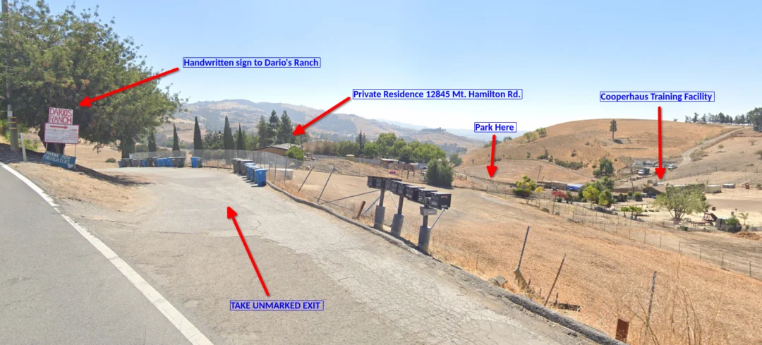 The outdoor dog training field is on an unmarked property off Mt. Hamilton Rd.The closest Google Maps location is a private residence at 12845 Mt. Hamilton Rd, San Jose, CA 95140.Please respect their privacy.Turn off the road when you see the hand-written sign for Dario’s Ranch, then immediately turn right in front of the house through the gate to the field.Drive through the gate past the house and park in the unpaved lot.Walk down to the training area.